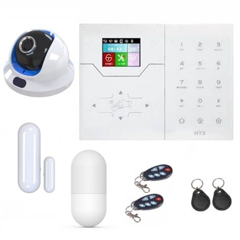 The package including alarm panel with ip camera and door sensor, intrusion detector PIR, remote controller and RF card.